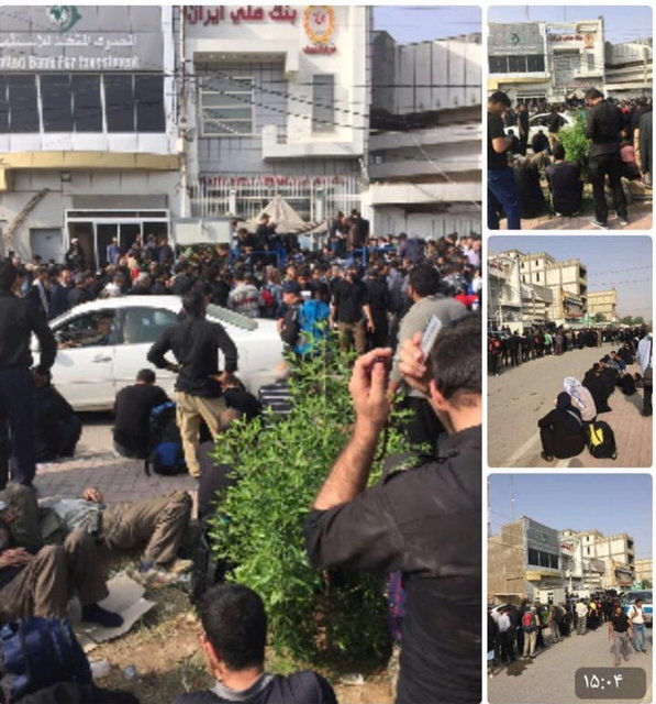 بنا به اظهارات این زائران، صفهای طولانی مقابل شعبه بانک ملی در شهر نجف تشکیل شده است و زائرانی که برای شرکت در مراسم مذهبی پیادهروی به عراق سفر کردهاند، مجبورند ساعتها در این صفها معطل بمانند تا ۱۰۰هزار دینار به نرخ دولتی دریافت کنند.