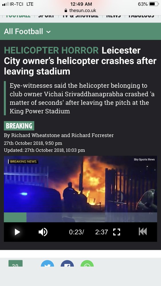 هلیکوپتر مالک تایلندی باشگاه لسترسیتی لحظاتی پس از ترک ورزشگاه کینگ پاور سقوط کرد و منفجر شد.