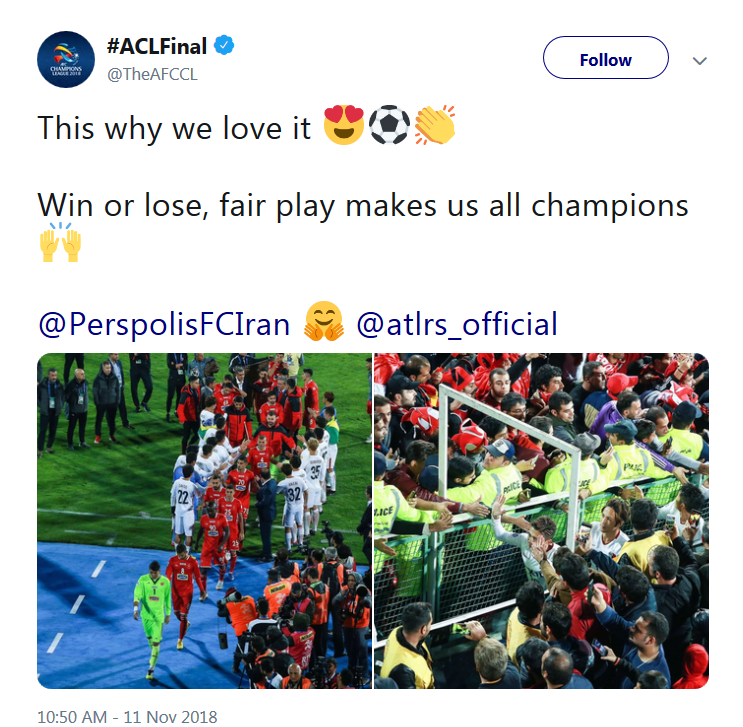 توییتر AFC امروز پس از این صحنه‌ها در فینال آسیا نوشت: این دلیل علاقه ما به فوتبال است. برد یا باخت، بازی جوانمردانه همه ما را به یک قهرمان تبدیل می‌کند.