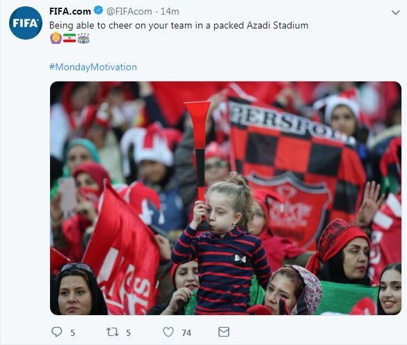 فیفا نوشت که بانوان ایرانی برای تشویق تیم خودشان به ورزشگاه آزادی راه پیدا کردند.