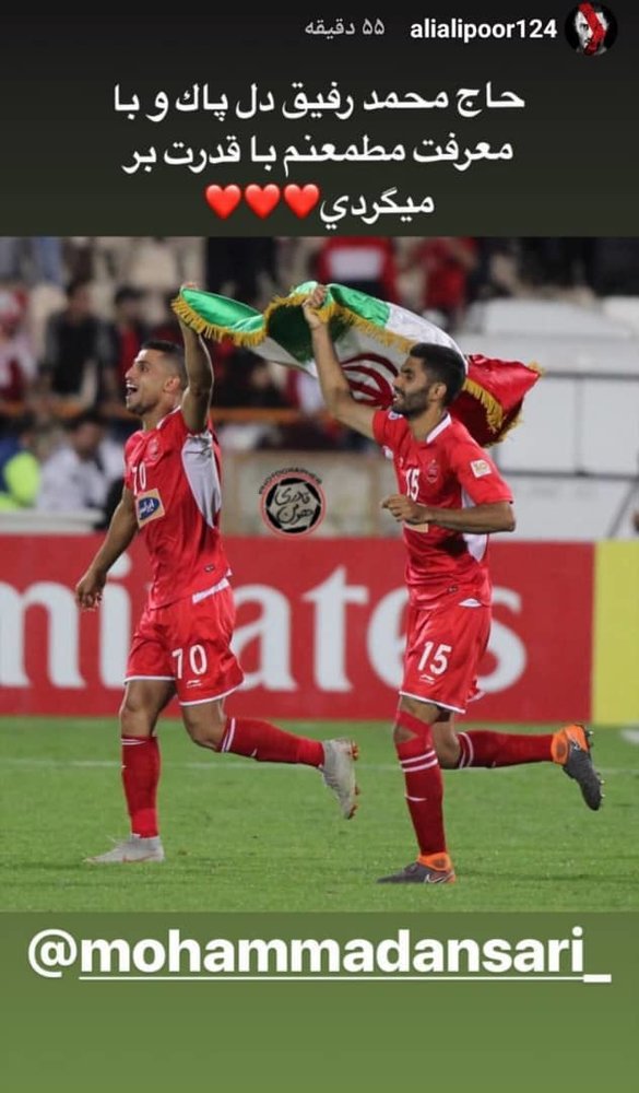 مصدومیت جزئی بیرانوند در تمرینات تیم ملی نیز نگرانی هواداران پرسپولیس را به همراه داشته است. با این حال مهاجم پرسپولیس ناامید نیست و برای هم تیمی اش بهترین ها را می خواهد. او برای محمد انصاری نوشت: "حاج محمد رفیق دل پاک و با معرفت مطمئنم با قدرت بر می گردی."