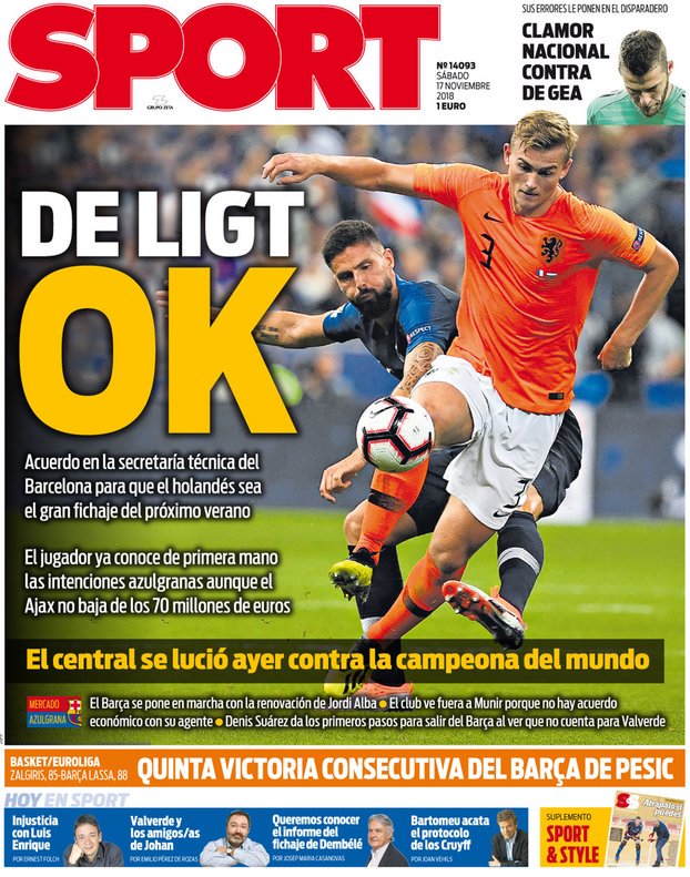 دیلیخت از اهداف باشگاه بارسلونا مطلع است اما آژاکس پیشنهاد کمتر از 70 میلیون یورو را قبول نخواهد کرد.