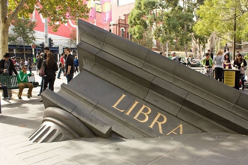 بیرون از ساختمان کتابخانه ویکتوریا، یک سازهی عجیب دیده میشود که گویی در حال غرق شدن است. این یک کتابخانه به سبک باستانی است که در حال غرق شدن در زمین است. این سازه با پهنای ۷ متر، توسط Petrus Spronk ساخته شده و به آن «تکه معماری» میگویند. این سازه یکی از چندین نمونه مشابه است که در نقاط مختلف دنیا ساخته شده و نمایانگر ضعیف و گذرا بودن بشریت هستند.