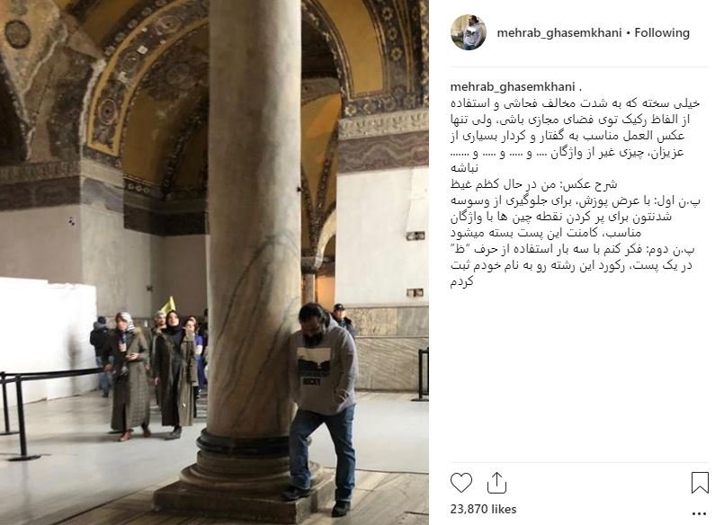 به گزارش جی پلاس، مهراب قاسمخانی که از فحاشیهای فضای مجازی به تنگ آمده در پستی که کامنتهای آن بسته شده است، چنین نوشت: «خیلی سخته که به شدت مخالف فحاشی و استفاده از الفاظ رکیک توی فضای مجازی باشی، ولی تنها عکس العمل مناسب به گفتار و کردار بسیاری از عزیزان، چیزی غیر از واژگان .... و ..... و ..... و ....... نباشه.»
