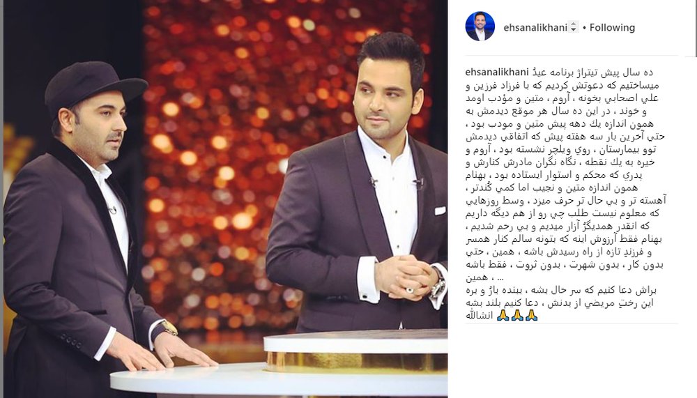 به گزارش جی پلاس، احسان علیخانی با انتشار تصویری از خود و بهنام صفوی در اینستاگرام، درباره این خواننده پاپ نوشت: «ده سال پیش تیتراژ برنامه عید رو میساختیم که دعوتش کردیم که با فرزاد فرزین و علی اصحابی بخونه، آروم، متین و مؤدب اومد و خوند، در این ده سال هر موقع دیدمش به همون اندازه یک دهه پیش متین و مودب بود، حتی آخرین بار سه هفته پیش که اتفاقی دیدمش تو بیمارستان، روی ویلچر نشسته بود، آروم و خیره به یک نقطه، نگاه نگران مادرش کنارش و پدری که محکم و استوار ایستاده بود، بهنام همون اندازه متین و نجیب اما کمی کُندتر، آهسته تر و بی حال تر حرف میزد، وسط روزهایی که معلوم نیست طلب چی رو از هم دیگه داریم که آنقدر همدیگر رو آزار میدیم و بی رحم شدیم، بهنام فقط آرزوش اینه که بتونه سالم کنار همسر و فرزندِ تازه از راه رسیدش باشه، همین، حتی بدون کار، بدون شهرت، بدون ثروت، فقط باشه، همین. براش دعا کنیم که سر حال بشه دعا کنیم بلند بشه انشالله.»