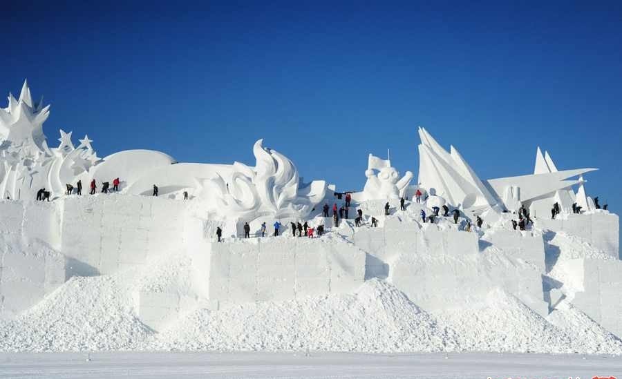 ۱۹ دسامبر ۲۰۱۸: کارگران چینی در حال ساخت مجسمهی اصلی فستیوال چند روز قبل از افتتاحیهی فستیوال هستند. این مجسمهی برفی، ۳۳ متر ارتفاع و بیش از ۱۰۰ متر طول دارد.