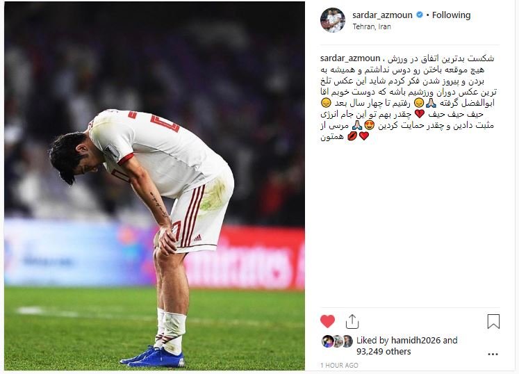به گزارش جی پلاس، تیم ملی ایران در نیمه نهایی جام ملتهای آسیا مقابل ژاپن با نتیجه 3-0 شکست خورد تا شاگردان کی روش بدون رسیدن به فینال از امارات برگردند. سردار آزمون مهاجم تیم ملی پس از حذف از جام ملتها در اینستاگرام خود نوشت:« شکست بدترین اتفاق در ورزش ، هیچ موقعه باختن رو دوس نداشتم و همیشه به بردن و پیروز شدن فکر کردم شاید این عکس تلخ ترین عکس دوران ورزشیم باشه که دوست خوبم اقا ابوالفضل گرفته. رفتیم تا چهار سال بعد.حیف حیف حیف . چقدر بهم تو این جام انرژی مثبت دادین و چقدر حمایت کردین.  مرسی از همتون.»