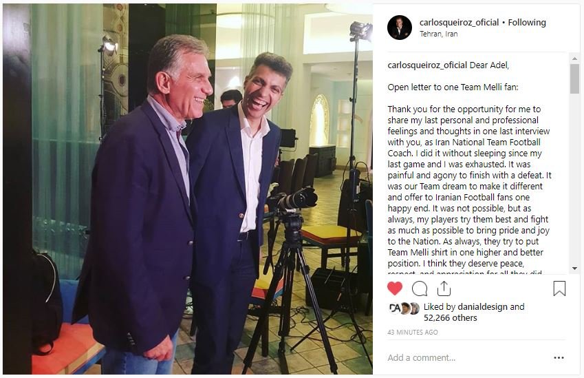 ممنون بابت فرصتی که در اختیار من قرار دادی تا به عنوان سرمربی تیم ملی ایران در آخرین مصاحبه من با تو، احساسات فردی و ملی‌ام را به اشتراک بگذارم. من اینکار را بدون خوابیدن بعد از آخرین بازی انجام دادم. این دردناک بود که با یک باخت تمام شود. این رویایی تیمی ما بود که به طرفداران تیم ملی یک پایان خوش را ارائه دهیم. این ممکن نشد، ولی همانطور که همیشه گفته شده، بازیکنان من بهترین تلاش خود را کردند تا شادی و افتخار را به مردم بدهند. من فکر می کنم آن ها بخاطر کارهایی که در 8 سال گذشته کردند مستحق صلح، احترام و تقدیر هستند. باور دارم که اکنون وقت انتقاد نیست بلکه یک فرصت است تا با استفاده از تجربیاتی مثبتی که در داستان 8 ساله خود گرفتیم، پیشرفت کنیم. ما به خودمان افتخار می کنیم چون به دنیا تصویر با پرستیژ و قابل احترامی را از فوتبال ایران نشان دادیم.