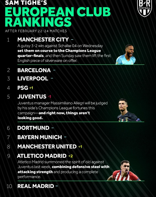 بارسلونا و لیورپول بدون تغییر در رده دوم و سوم قرار دارند. پاری سن ژرمن یک پله صعود کرده و در رده چهارم است و یوونتوس رده پنجم را به خود اختصاص داده است.