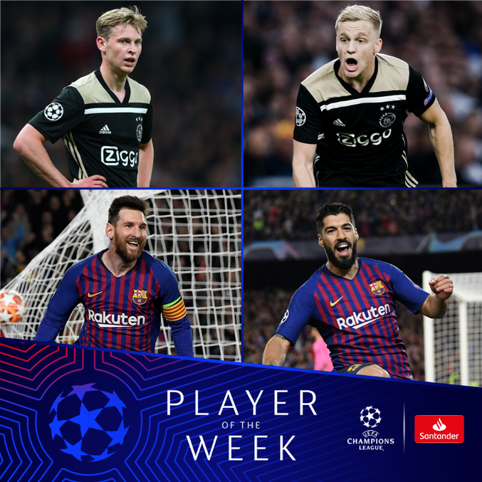 لیونل مسی و لوئیس سوارس از بارسلونا و فرانکی دی یانگ و دونی فان دبیگ از آژاکس نامزدهای کسب عنوان جایزه بهترین بازیکن هفته هستند.