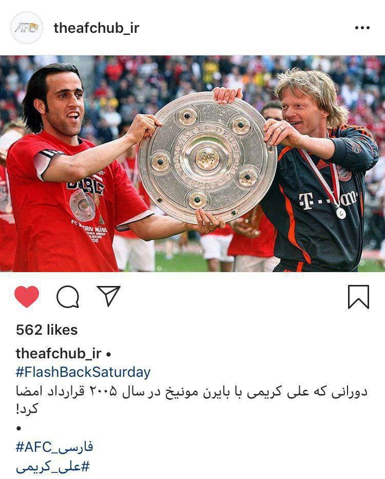 صفحه فارسی اینستاگرام کنفدراسیون فوتبال آسیا عکسی از علی کریمی در دوران بازی در بایرن مونیخ منتشر کرد.