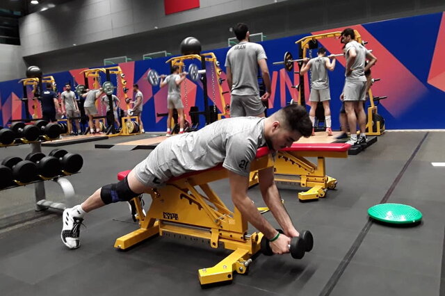 پس از حدود یک ساعت کار با توپ، بازیکنان به سالن بدنسازی هدایت شدند. روحیه بالای ملیپوشان موجب شده بود با وجود خستگی سفر ۱۴ ساعته از تهران تا جیانگمِن، همه تمرین با نشاطی را پشت سر بگذارند.