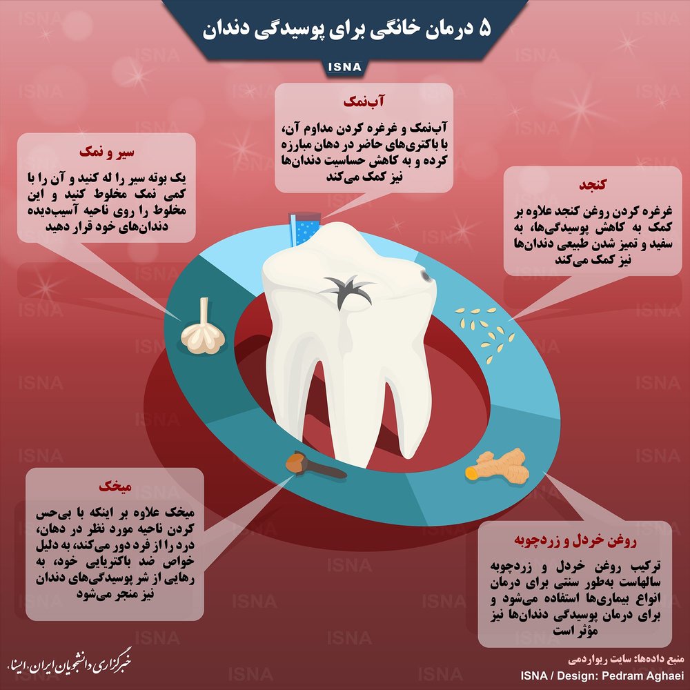 به گزارش جی پلاس ، پوسیدگی دندان به عوامل مختلی بستگی دارد ولی همه آنها چند راه ثابت برای درمان دارند. در این اینفوگرافیک چند مورد از درمانهای خانگی برای پوسیدگیهای دندان، به نقل از اطلاعات سایت ریواردمی آورده شده است.