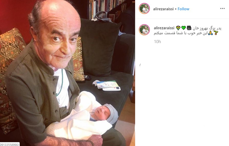 به گزارش جی پلاس، علیرضا رئیسی بازیگر سریال «دنیای شیرین» که کارگردانی آن را بهروز بقایی برعهده داشت، تصویری از این هنرمند را در اینستاگرام منتشر کرد و از پدربزرگ شدنش خبر داد.