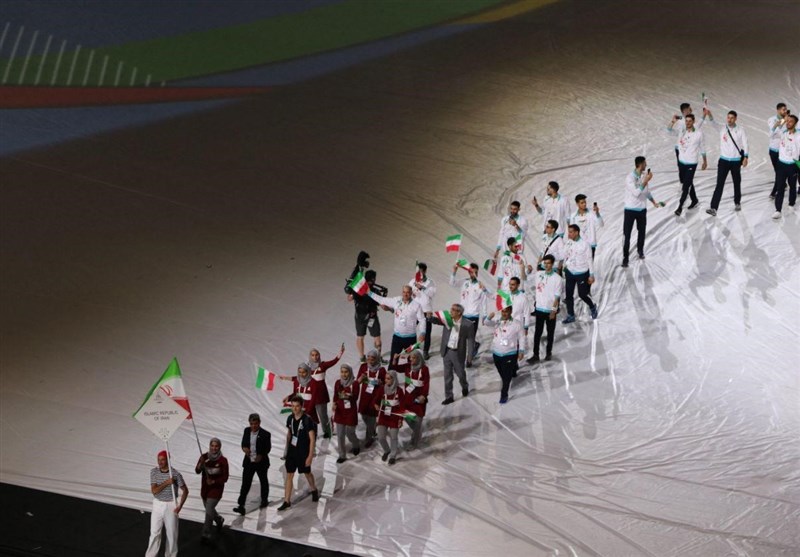 در این مراسم کاروان ایران با ورزشکاران رشتههای تیراندازی و والیبال و همچنین مسئولان کاروان رژه رفت. نجمه خدمتی پرچمدار ایران در مراسم افتتاحیه بود.