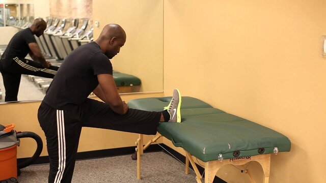 در فاصله نیم یا یک متری تخت خود قرار گرفته و رو به آن بایستید. پای راست خود را روی لبه تخت قرار دهید، زانوی راست خود را خم کرده و در حالی که پای چپ خود را روی زمین قرار دادهاید، وزن خود را به آرامی به سمت جلو منتقل کنید. پنجههای هر دو پا باید به سمت جلو قرار گرفته باشند.