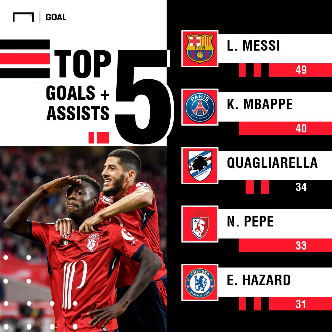 لیونل مسی در مجموع با 49 گل و پاس گل تاثیرگذارترین بازیکن فصل لقب گرفته است و پس از وی ام باپه با 40، کوالیارلا 34، په په 33 و هازارد با 31 گل و پاس گل در ردههای بعدی قرار دارند.