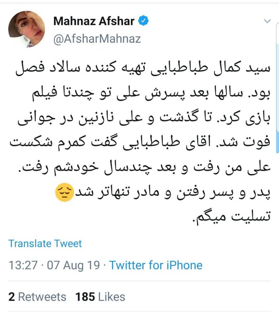 مهناز افشار در پی در گذشت سیدکمال طباطبایی، تهیهکننده سینما که امروز (چهارشنبه ۱۶ مرداد) به علت ایست قلبی در گذشت. توئیتی را منتشر کرد.