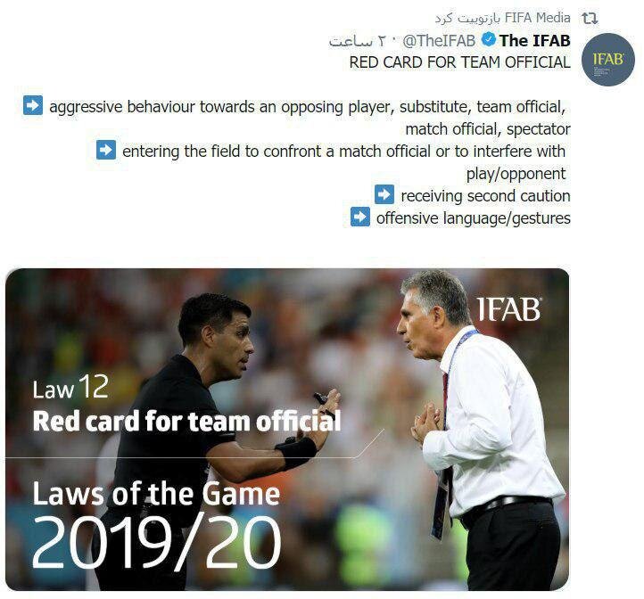 به گزارش جی پلاس، فدراسیون جهانی فوتبال توئیتی را از هیئت بینالمللی فوتبال (IFAB) که تنها نهاد قانون گذار در فوتبال است بازنشر داده که در آن از تصویر کارلوس کیروش،سرمربی سابق تیم ملی فوتبال ایران برای توضیح قانون جدید تصویب شده که هشداری برای مربیان و مسئولان تیمهاست، استفاده شده است. این قانون که قانون شماره «12» نام دارد به داور مسابقه این اجازه را میدهد که در موارد زیر به مربیان و مسئولان تیم کارت قرمز نشان دهد:
