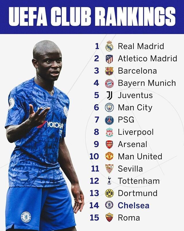به گزارش جی پلاس، در رده بندی اعلام شده از سوی اتحادیه فوتبال اروپا بار دیگر تیم فوتبال رئال مادرید به عنوان اولین تیم برتر قاره سبز اعلام شد. این در حالی است که قهرمان فصل گذشته لیگ قهرمانان یعنی لیورپول در رده هشتم جا گرفته و بارسلونا، رقیب همیشگی رئال مادرید در این رده بندی سوم است.