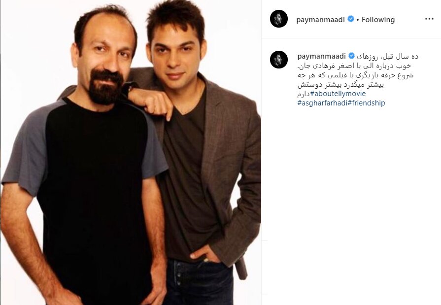 به گزارش جی پلاس، پیمان معادی تصویری قدیمی از خود و اصغر فرهادی را در اینستاگرام به اشتراک گذاشت و از روزهای خوب فیلم سینمایی «درباره الی» اینچنین نوشت: «ده سال قبل، روزهای خوب «درباره الی» با اصغر فرهادی جان. شروع حرفه بازیگری با فیلمی که هر چه بیشتر میگذرد بیشتر دوستش دارم.»
