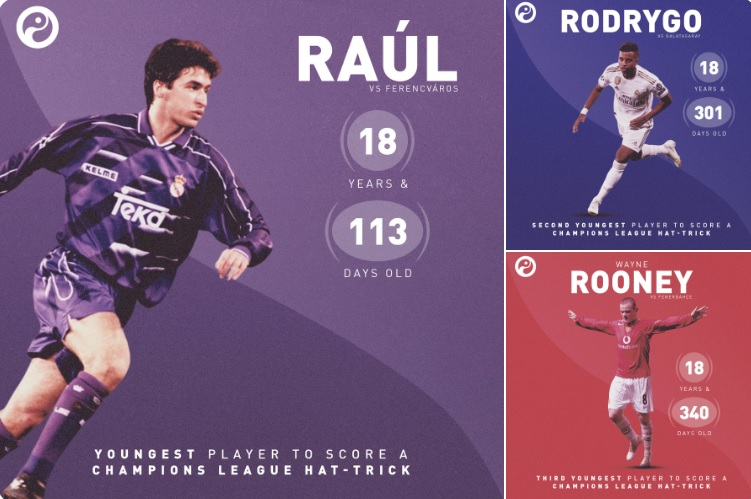 رائول گونزالس با 18 سال و 113 روز جوانترین هت‌تریک کننده لیگ قهرمانان اروپا است.
