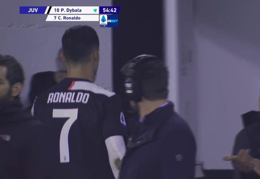رونالدو 34 ساله که اولین تعویض مائوریتزیو ساری در این بازی بود، پس از اینکه جای خود را به پائولو دیبالا آرژانتینی داد، به جای اینکه به روی نیمکت تیمش برود، در حالی که از تعویض شدنش عصبانی و ناراحت به نظر میرسید و رو به نیمکت تیم به زبان پرتغالی چیزی گفت، مستقیم به رختکن رفت.