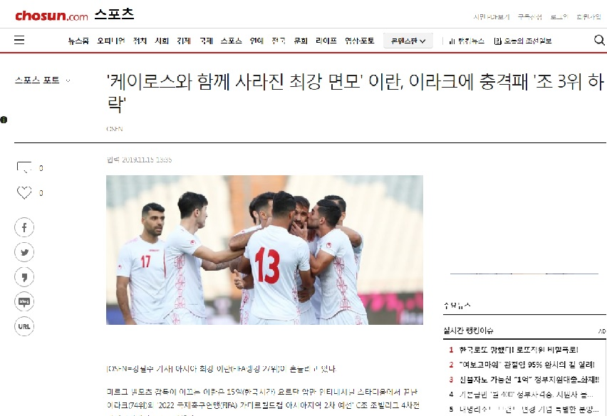 گزارشگر چوسون در ادامه مطرح کرد تیم عراق با بردی که شب گذشته کسب کرد، در گروه سوم 10 امتیازی شد اما تیم ایران به خاطر دو ناکامی اخیرش، با 6 امتیاز در رده سوم گروه بعد از بحرین جای گرفته است.