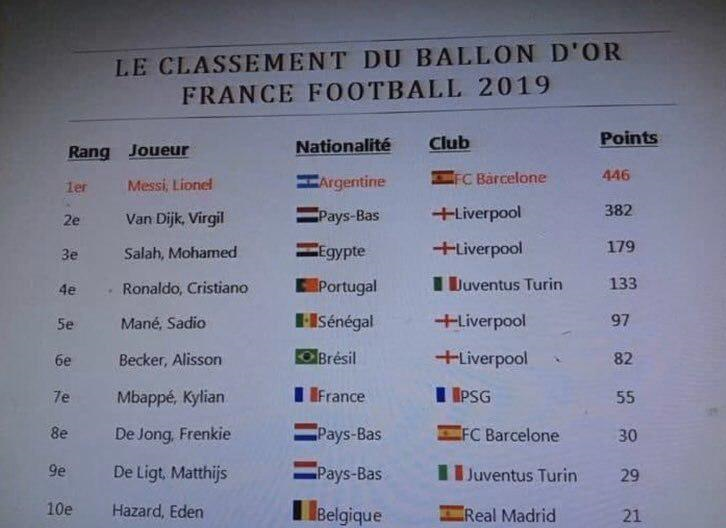 در فضای مجازی لیستی منتشر شد که نشان می دهد ابر ستاره بارسلونا برنده توپ طلای 2019 است.