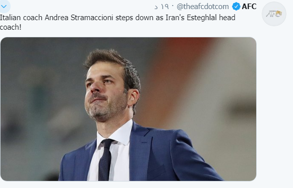 جدایی استراماچونی از استقلال در توییتر رسمی AFC بازتاب داشت و این صفحه تایید کرد که سرمربی آبی‌های پایتخت از سمت خود در این تیم کناره‌گیری کرده است.