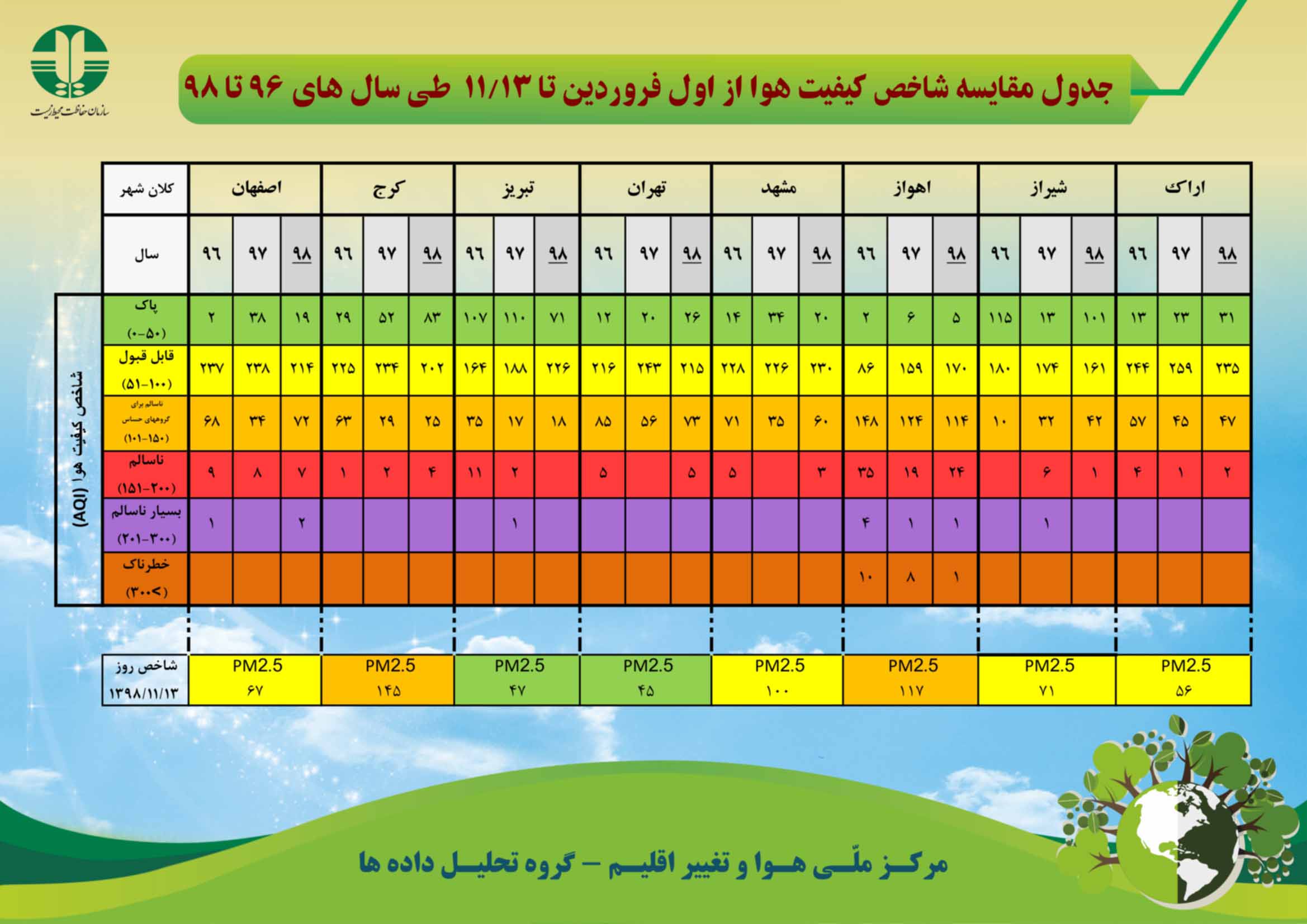 جدول مقایسه کیفیت هوا از اول فروردین تا 13 بهمن ماه طی سال های 96 تا 98 منتشر شد.