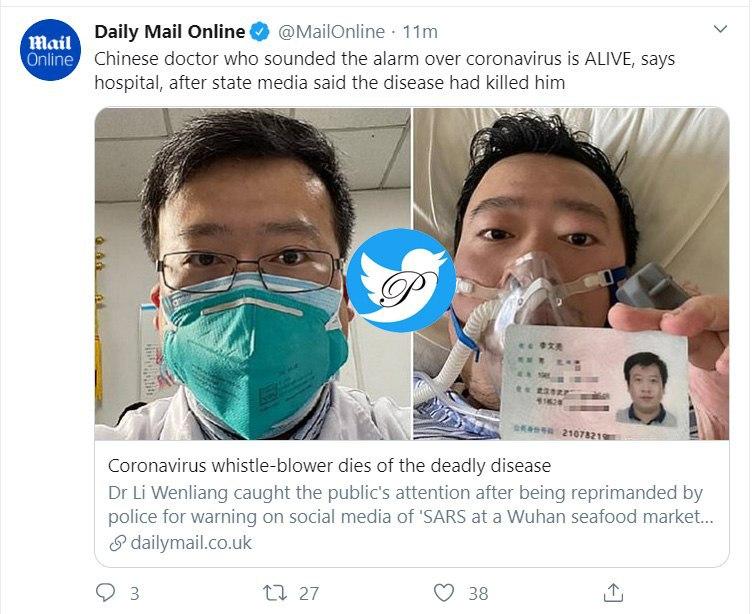 شایعه شده بود که پزشک 34 ساله در ووهان به دلیل ابتلا جان خود را از دست داده است اما معلوم شد وی زنده است.