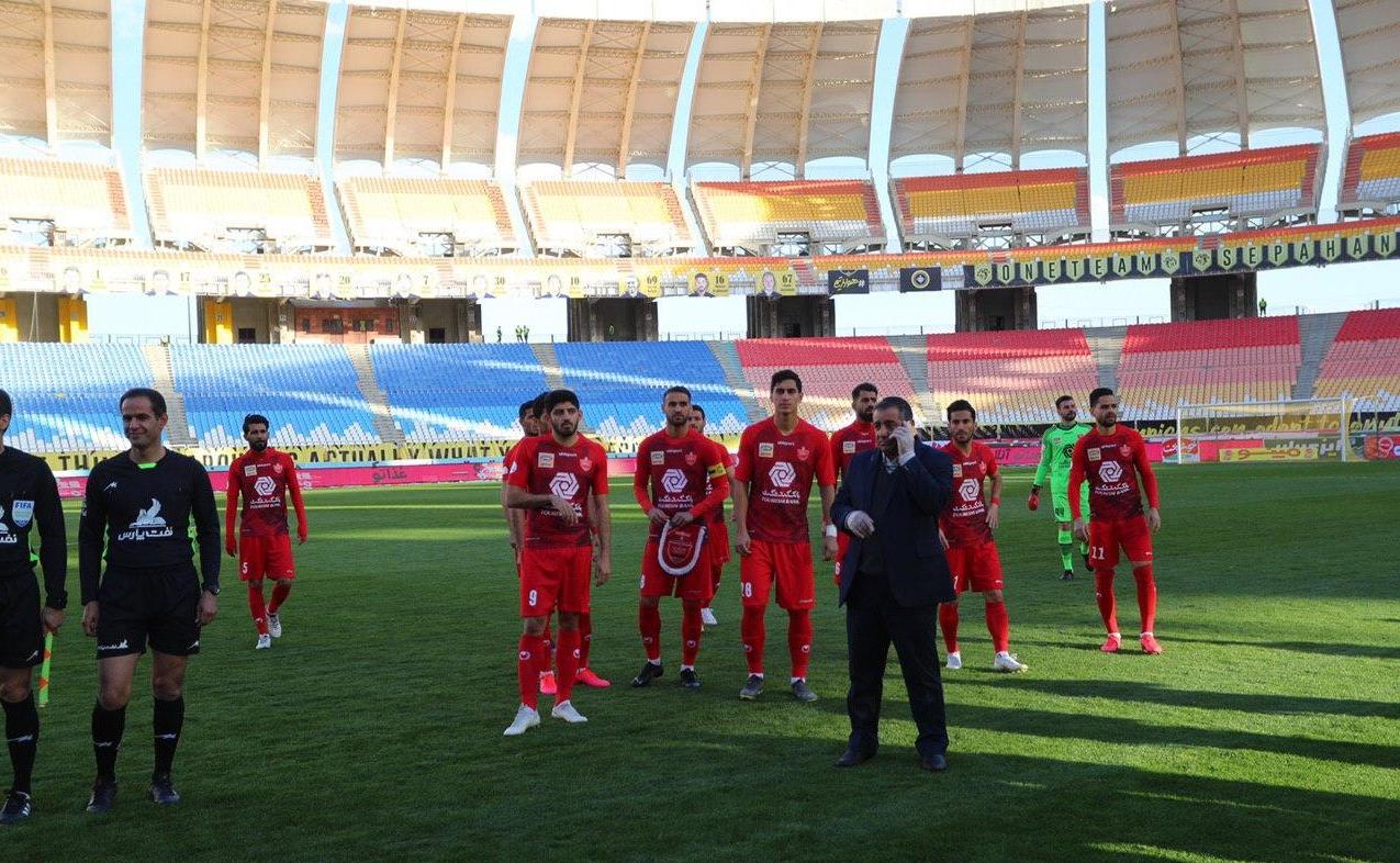 پرسپولیس ۱۶:۱۵ درون زمین نقش جهان بود و داوران و مجریان بازی همه بودند، اما میزبان نبود! بعد از نیم ساعت صف بستند و داور طبق قانون نیم ساعت دوم را هم لحاظ کرد، بعد از ۱۰ دقیقه اتوبوس سپاهان رسید و زردها به رختکن رفتند، اما ۱۷:۱۵ شد ۱۷:۲۵ و باز کسی بالا نیامد! داور سوت پایان مسابقه را زد و پرسپولیسیها سوار اتوبوس شدند و رفتند تا سپاهان از رختکن بیرون آمده و در ورزشگاه خالی تمرین کند!