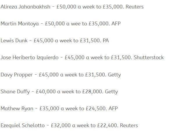 این رسانه رقم کاهش دستمزد هفتگی بازیکنان برایتون را به تفکیک منتشر کرد. علیرضا جهانبخش، هافبک ایرانی این تیم انگلیسی که جزو گران قیمت ترین بازیکنان به شمار می آید هر هفته 50 هزار پوند دستمزد دارد که در ایام تعطیلات این رقم به 35 هزارپوند کاهش پیدا می کند. یعنی جهانبخش از ویروس کرونا هر هفته به مبلغ 15 هزار پوند(تقریبا 280 میلیون تومان) ضرر می بیند.