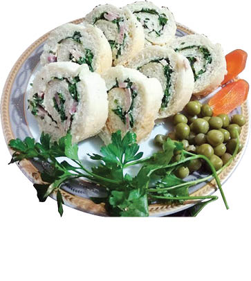 در آخر یک عدد نان باگت یا لواش بر می داریم و مواد را به صورت یک لایه نازک بر روی نان می گذاریم و برای زیبایی کار، نان را رول می کنیم و به صورت لقمه ای برش می دهیم و به دلخواه تزئین می کنیم.