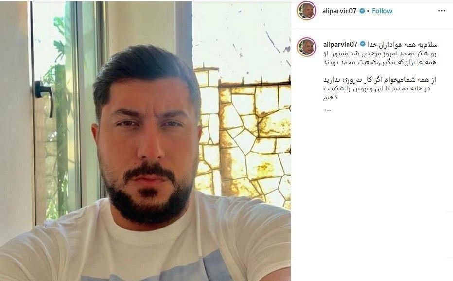 علی پروین در اینستاگرامش در این مورد نوشت:« سلام‌به همه هواداران خدا رو شکر محمد امروز مرخص شد ممنون از همه عزیزان‌که پیگیر وضعیت محمد بودند. از همه شمامیخوام اگر کار ضروری ندارید در خانه بمانید تا این ویروس را شکست دهیم.»