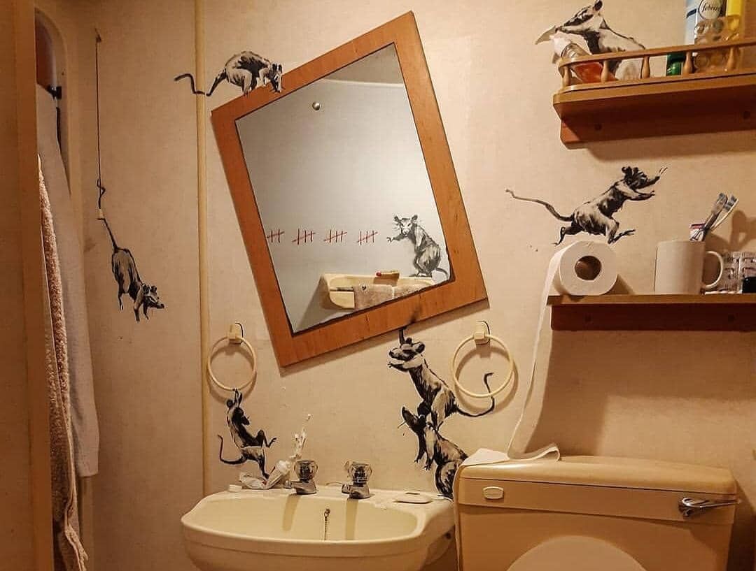 یکی از این موش‌ها از لامپ دستشویی بنکسی آویزان شده است.