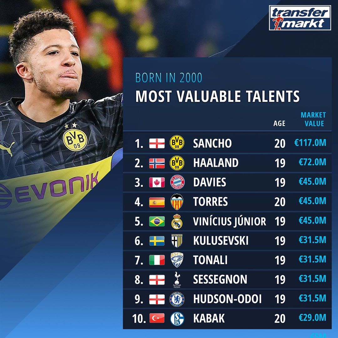 به گزارش جی پلاس، این رسانه نقل و انتقالاتی نگاهی به بازیکنان جوان متولد 2000 داشته و بر این اساس، سانچو و هالند از دورتموند به ترتیب با 117 و 72 میلیون یورو 2 نفر برتر این فهرست هستند.