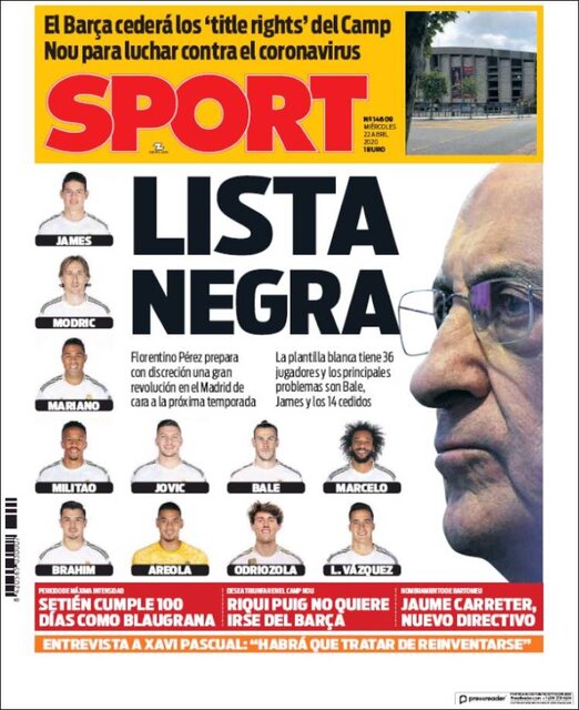 به گزارش جی پلاس، صفحه نخست روزنامه اسپورت کاتالونیا برای بیست و دوم آوریل (۳ اردیبهشت) به رئال مادرید اختصاص داده شده است. نشریه اسپانیایی به لیست سیاه تیم مادریدی اشاره کرد که در این میان نام های برجسته ای همچون مارسلو و لوکا مودریچ دیده می شود. این دو بازیکن از ارکان اصلی سفیدپوشان در چهار قهرمانی لیگ قهرمانان اروپا بودند. بر اساس اعلام اسپورت دو بازیکن با تجربه مادرید در این تابستان اسپانیا را ترک خواهند کرد.