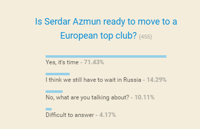 از میان ۴۵۵ شرکت کننده در این نظر سنجی، حدود ۷۱.۴۳% درصد موافق حضور آزمون در تیمهای اروپایی هستند. ۱۴.۲۹ درصد هم معتقدند که آزمون باید دست نگه دارد و در روسیه فوتبال خود را ادامه دهد. ۱۰.۱۱% درصد نیز مخالف خروج آزمون از لیگ روسیه هستند و ۴.۱۷ درصد هم پاسخ به این سوال برای شان مشکل بوده است.