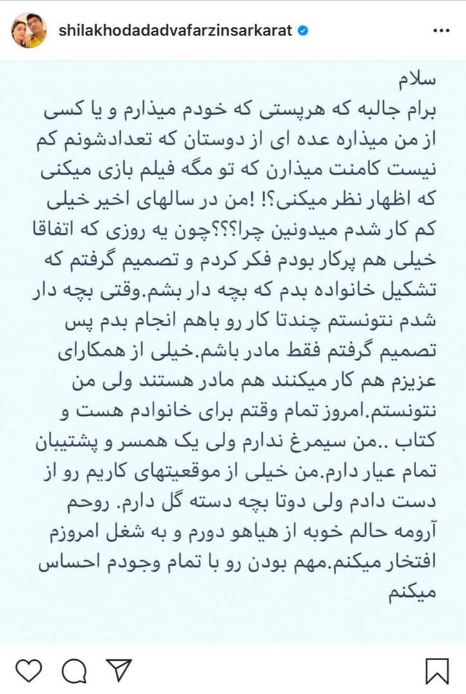 شیلا خداداد، بازیگر سینما که اخیرا کم‌کار شده است، پستی را برای توضیح این موضوع در صفحه شخصی اینستاگرام خود منتشر کرد.
