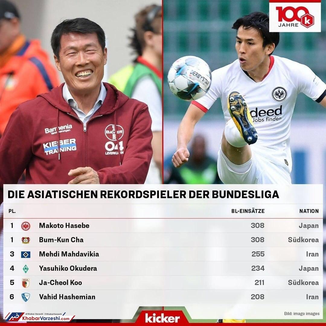 به گزارش جی پلاس، این دو ستاره فوتبال ایران که سال ها در لیگ آلمان مشغول بازی بودند، حالا از سوی کیکر در بین باسابقه ترین آسیایی های این لیگ قرار گرفته اند و در بین ۶ نفر نخست قرار دارند. در صدر این جدول ماکوتو هاسِبه به همراه بوم کون چا جای گرفته که البته ها سه به فرصت این را دارد که در هفته جاری با بازی در تیم اینتراخت فرانکفورت به تنهایی صدرنشین شود. بوم چا که اکنون ۶۷ ساله است، از سال ۱۹۷۸ تا ۱۹۸۹ در تیم های مختلف آلمانی حضور داشت و حالا رکورد خود را از دست رفته میبیند.
