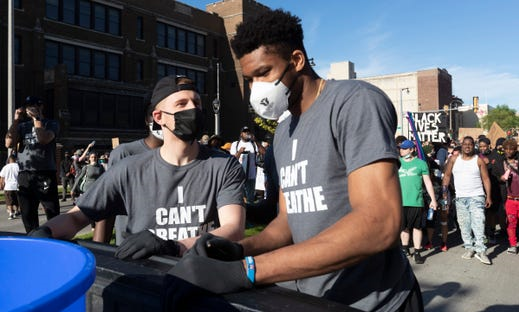یانیس آنتتوکومپو که ارزشمندترین فصل گذشته NBA شد و در این فصل نیز با میلواکی در صدر جدول کنفرانس شرق قرار دارد، برای اعتراض به نژادپرستی به خیابان آمده و حتی بطریهای آب را هم در میان آنها توزیع کرد. او تی شرتی را بر تن داشت که جمله «نمیتوانم نفس بکشم» نوشته شده بود.