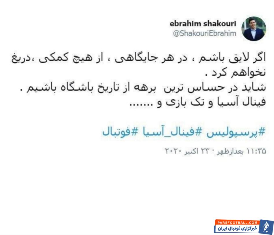 ابراهیم شکوری ، مدافع پیشین پرسپولیس که دارای دکترای مدیریت ورزشی است با انتشار پیامی در فضای مجازی آمادگی خود برای مدیریت در باشگاه پرسپولیس را اعلام کرد.