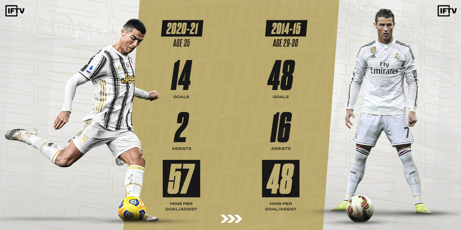 به همین بهانه مقایسه‌ای میان عملکرد رونالدو در 35 سالگی با بهترین فصل حضور خود در سال 15-2014، انجام شده است که نشان می‌دهد که رونالدو چندان با زمان اوج خود فاصله ندارد.
