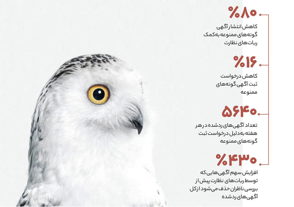عملکرد ربات هوشمند در شناسایی آگهیهای ممنوعه حیات وحش به این ترتیب بوده که ۸۰ درصد از این آگهیها را در همان مرحله اول شناسایی و حذف کردند. به این ترتیب ۱۶ درصد درخواست ثبت آگهی گونههای ممنوعه کاهش یافته و به عبارتی هر هفته ۵۶۴۰ درخواست آگهی ممنوعه با همین سیستم نظارت هوشمند حذف شده است. یک آمار دیگر که ناامیدی متخلفین را ثابت میکند این است که تعداد آگهیهای ممنوعه درخواستی از ۹۵۰ به ۷۵۰ آگهی در هفته رسیده. بعد از اعمال فیلتر محتوای بد برای تعدادی از گونههای ممنوعه در دو مرحله، نرخ رد آگهی خرید و فروش حیوانات به دلایل زیست محیطی ۵۵ درصد زیاد شده. یکی از چالشهای سایت دیوار برای برخورد با آگهیهای نامتعارف و غیر مجاز حیات وحش این بود که فقط متخصصین این حوزه با اسم بعضی گونهها آشنایی دارند. یعنی نه با ربات هوشمند و نه با کارشناسان عمومی میشد این آگهیها را شناسایی کرد. بعد اما با وارد کردن فیلتر زیست محیطی و فهرستی که با کمک فعالان محیط زیست تهیه شد کار ناظران سبک تر شد. قبلا ۹۵ درصد آگهی مربوط به گونههای ممنوعه توسط ناظران حذف میشد اما حالا این مقدار به ۶۸ درصد رسیده است. به بیان دیگر تعداد آگهیهای شناسایی شده توسط رباتهای هوشمند با ساز و کار جدید ۵.۳ برابر شده.