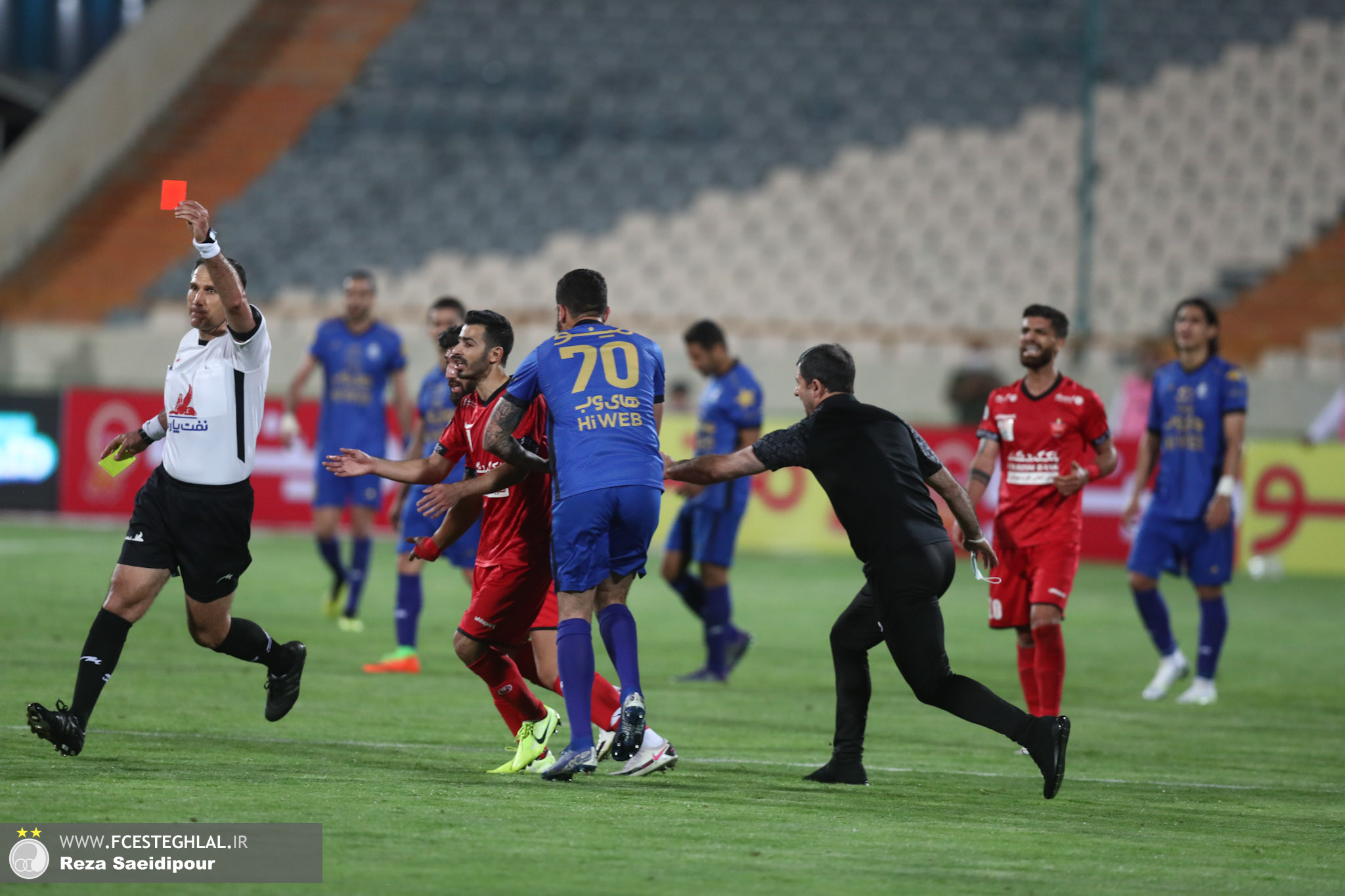 در کنار هر خطا و زمین خوردن هم بارها بازیکنان و مربیان دو تیم از کنار خط محوطه جریمه بر سر داور و تصمیماتش داد میزدند؛ به طوری که محمدرضا احمدی، گزارشگر مسابقه از کلمات و جملات رد و بدل شده در ورزشگاه خالی از تماشاگر آزادی متعجب شد!