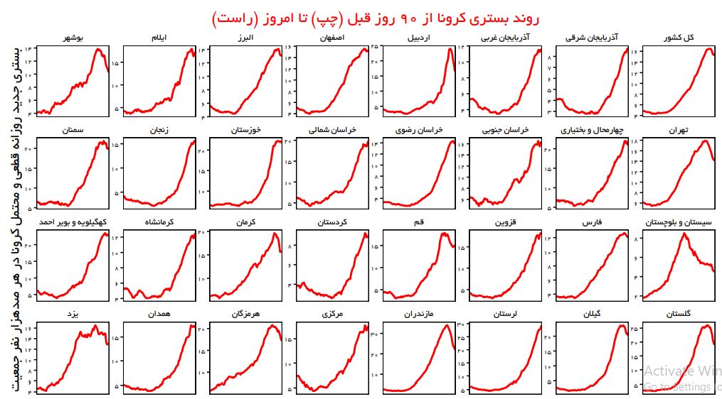 اما همین نمودارها نشان می دهد که برخی از استان های کشور هنوز به قله نمودار خود نرسیده اند و این به این معنی است که در ر.زهای آیند این مناطق شاهد شیوع بیشتر ویروس و در نهایت افزایش میزان موارد بستری خواهند بود.