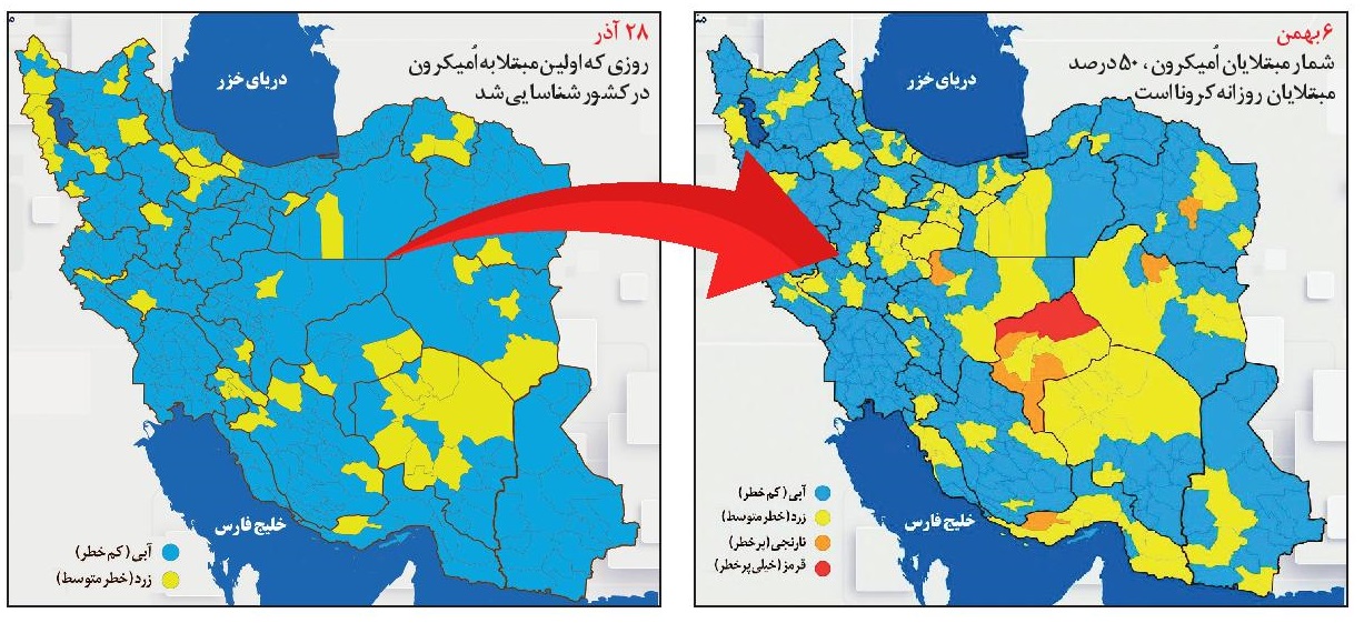 روزنامه اعتماد نوشت: طبق اعلام وزارت بهداشت از آخرین وضعیت شیوع کرونا در کشور، تعداد مبتلایان جدید کرونا در شبانه روز 5 تا 6 بهمن، با افزایش 26.3 درصدی (2473 نفر) نسبت به شبانه‌روز 4 تا 5 بهمن، به 11851 نفر رسید در حالی که پیش‌بینی متخصصان این است که ظرف هفته آینده، آمار مبتلایان در کشور، با رشد انفجاری همراه خواهد شد. نگاهی به آمار روزانه افزایش ابتلا در کشور نشان می‌دهد که وضعیت امروز و شیب صعودی تعداد مبتلایان، از دهه دوم آذر‌ماه (بعد از شناسایی اولین مبتلای اُمیکرون در کشور) قابل مشاهده و پیش‌بینی بود در حالی که دولت و اعضای ستاد ملی مقابله با کرونا، هیچ اقدام پیشگیرانه‌ای برای جلوگیری از حادتر شدن وضعیت انجام ندادند چنان‌که ظرف 45 روز گذشته، بسیاری از مراسم آیینی و ملی، بدون رعایت هیچ محدودیت و توجه به پروتکل‌های بهداشتی برگزار شد و برخلاف بسیاری ادعاها درباره ضرورت ارایه کارت واکسیناسیون در هنگام ورود به ادارات دولتی یا مراکز پرتجمع، مشاهدات ظرف هفته‌های اخیر نشان داد که در هیچ اداره دولتی یا مراکز پر ازدحام، از مراجعان کارت واکسیناسیون مطالبه نشده علاوه بر آنکه در بسیاری ادارات دولتی و مراکز پرازدحام و از جمله متروی تهران یا مراکز خرید مسقف، افرادی را می‌توان مشاهده کرد که نه‌تنها ماسک بر صورت ندارند، سایر الزامات مورد تاکید وزارت بهداشت و از جمله فاصله‌گذاری اجتماعی یا باز بودن پنجره‌ها در فضاهای بسته را هم رعایت نمی‌کنند و هیچ ماموری هم برای تذکر این تخلفات محرز، حضور ندارد.