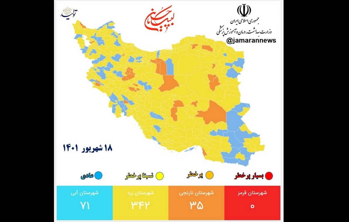 سخنگوی وزارت بهداشت امروز 18 شهریور 1401 آخرین وضعیت رنگبندی شهرهای کشور از نظر شیوع کرونا را اعلام کرد که طبق آن بیش از ۹۰ درصد شهرهای کشور در وضعیت زرد و آبی قرار دارند.